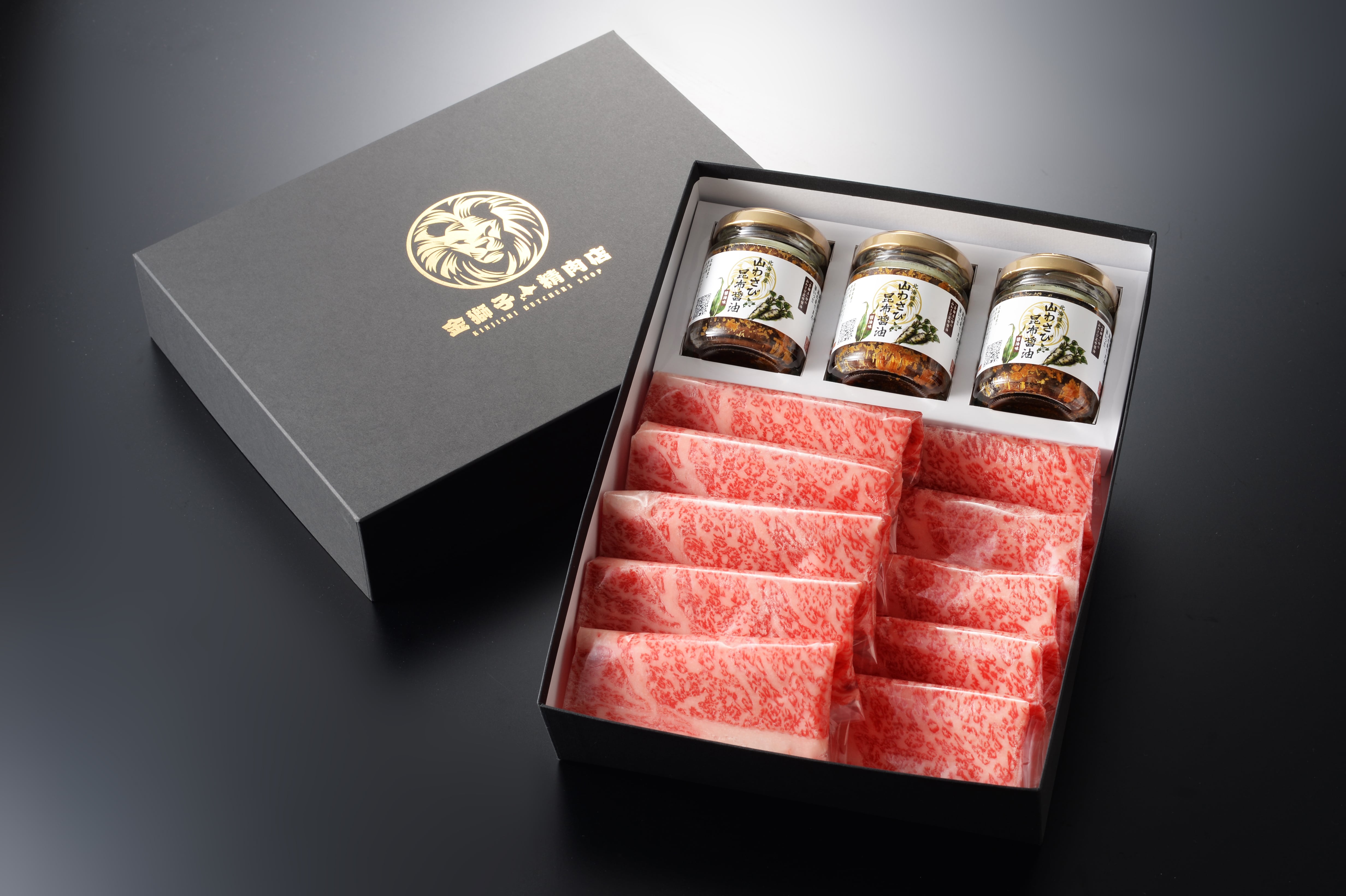 ご家庭でのしゃぶしゃぶやすき焼きにぴったりな「厳選黒毛和牛ロース」と、肉の旨み引き立つ万能調味料「山わさび昆布醤油」のセット商品。